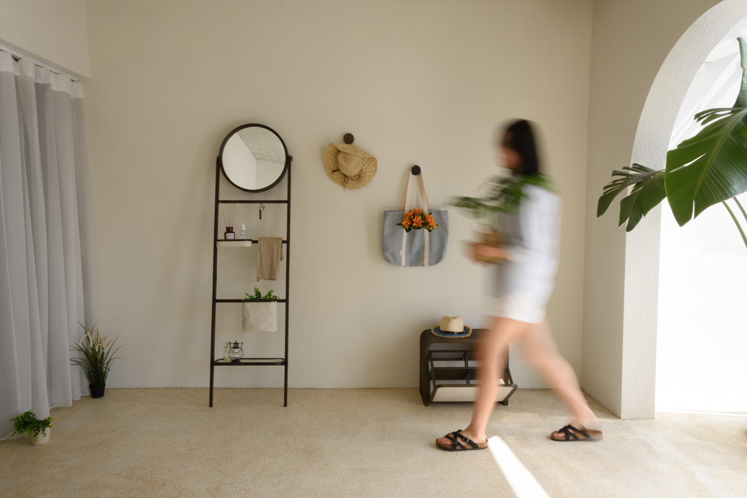 適合放在玄關的多功能置物架,可調整角度的大圓鏡、4 個方便吊掛鑰匙小物的掛勾、一深一淺的活動置物籃、還有最下層的置物平台,每一層都可以妥善利用,找出最適合自己使用習慣的置物方式。