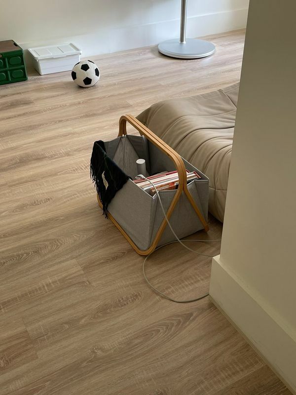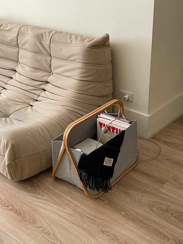 客廳Togo 沙發旁放「好迪Gatsby提籃」布料pantone 亞麻藍很百搭耐看,配上大容量的收納設計,對於家裡有玩具的爸媽真的是相當友善,讓整個空間整齊又增添美觀!
