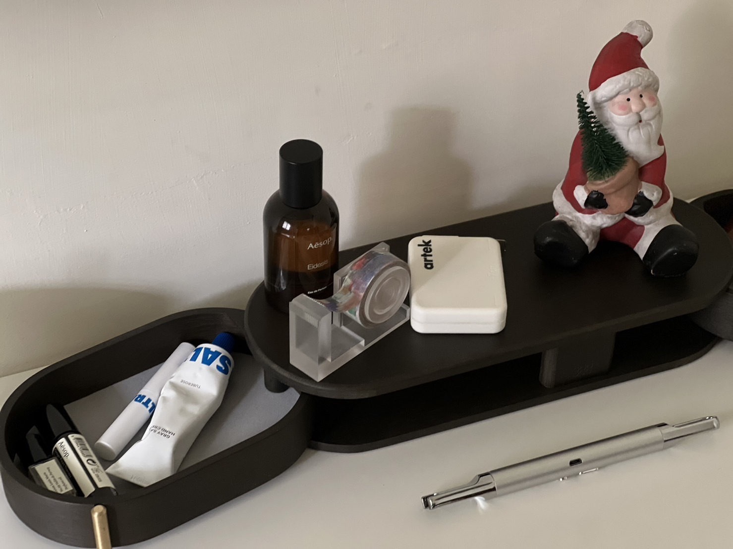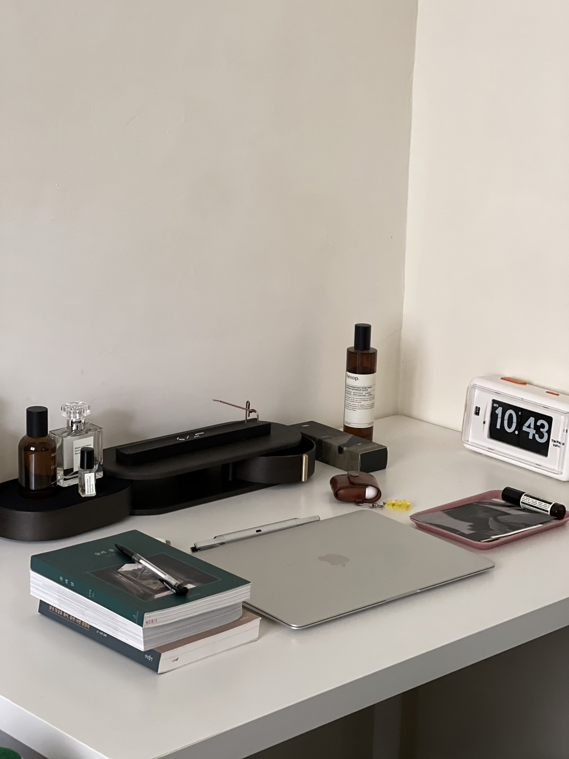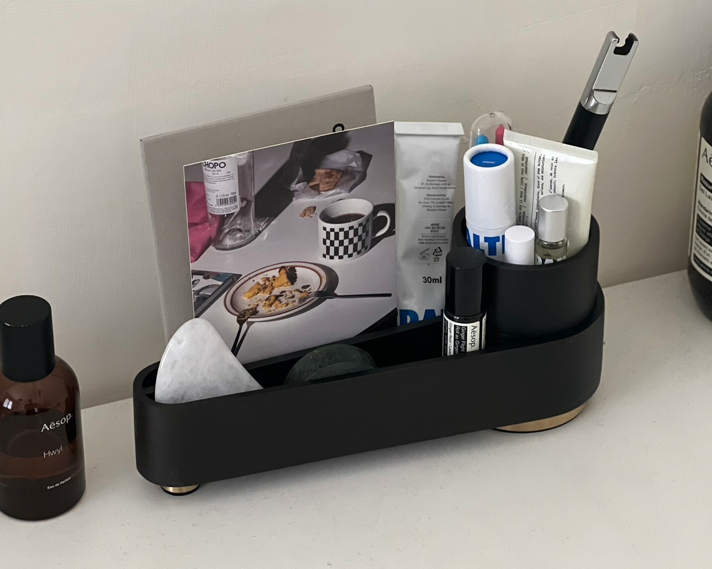 當時一看到這個 ORSON 收納就很喜歡,開始想像它放在我桌上的樣子。可以把當日香氣這樣展示在上面,好像也挺有趣,有時擺放香水,大多時候我會將我的線香座展示在上方。香氣這種充滿儀式感的事物,自然得給它一個合適的舞台。