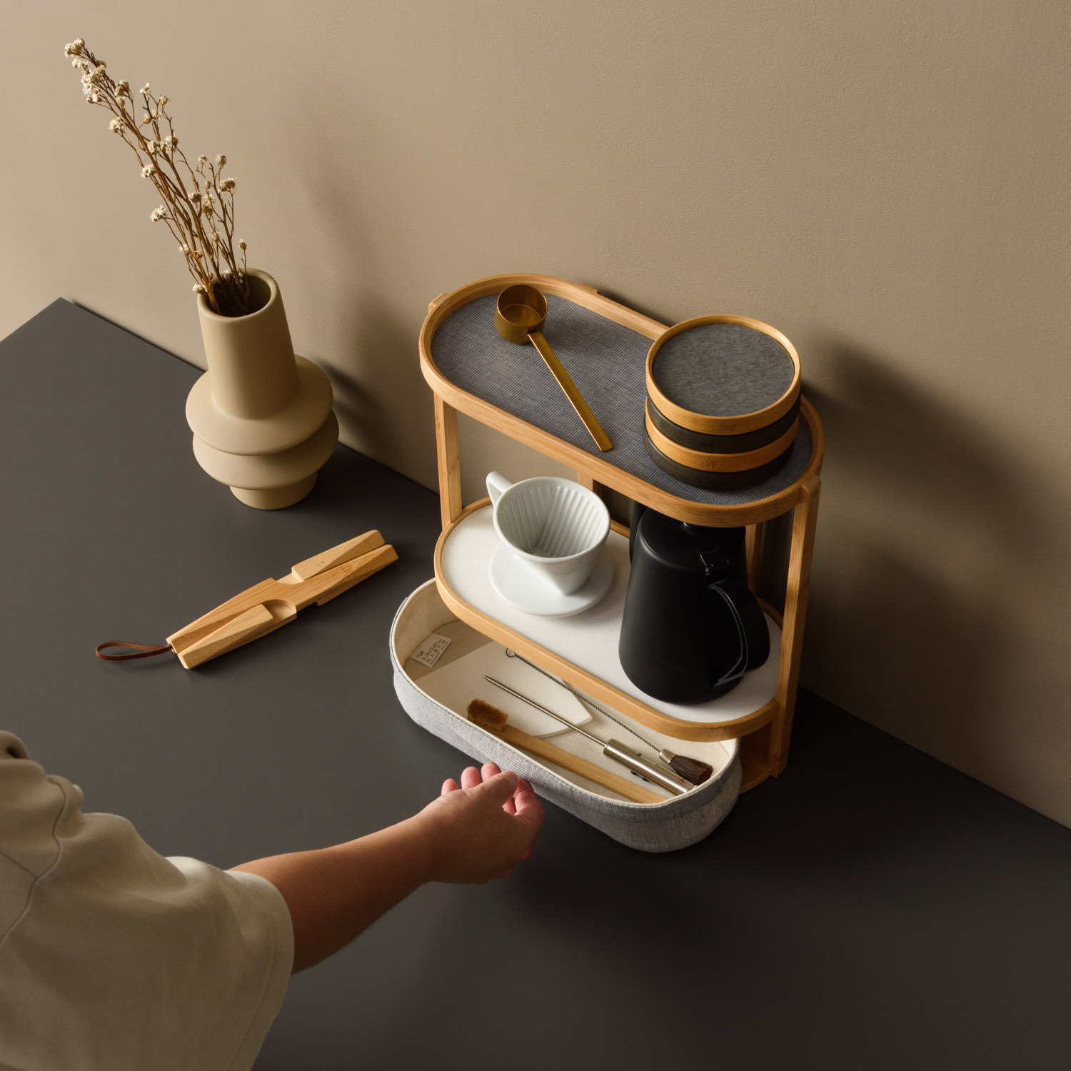 TRIVI 咖啡雙層置物架適合擺放在家中或是辦公室的專屬咖啡區,除了提供基本的收納功能之外還兼顧展示的特性,讓你精心挑選的咖啡器材不需關進廚櫃裡,而是能以開放式的層架展示出來,更有生活的溫度。洗好的咖啡壺、咖啡濾杯、咖啡濾紙與咖啡豆等皆可放置在適合的位置。