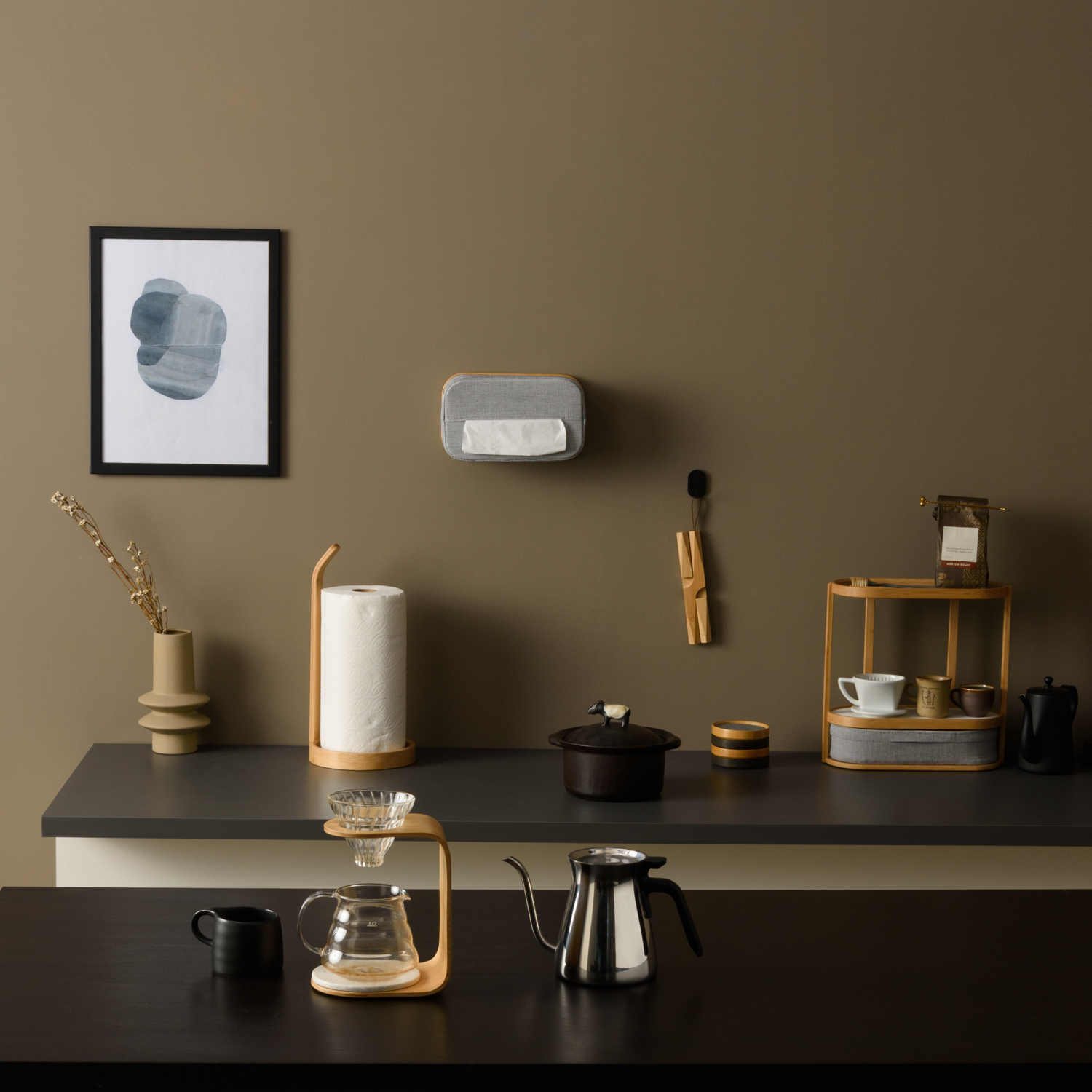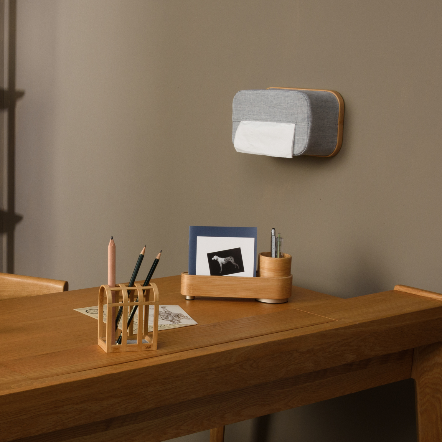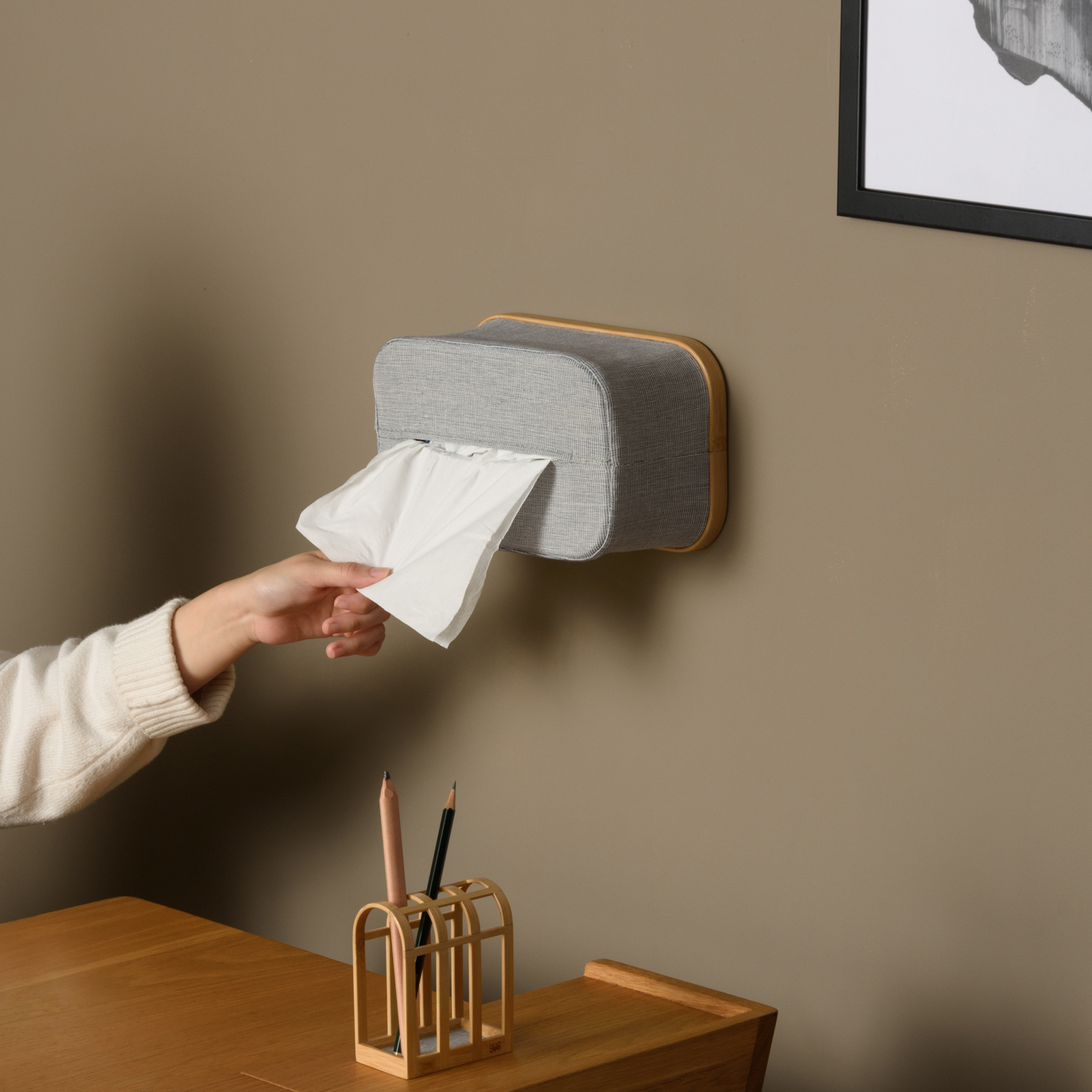 ESOBI 掛牆面紙盒承襲經典 ESOBI 簡約優雅的竹布外型,並設計了聰明的磁扣吊掛方式,在使用過程中不論取下或掛上都十分便利。且適用於多種空間,只要是垂直可黏貼的牆面,不論在客廳、臥室、廚房或是辦公室都方便使用。