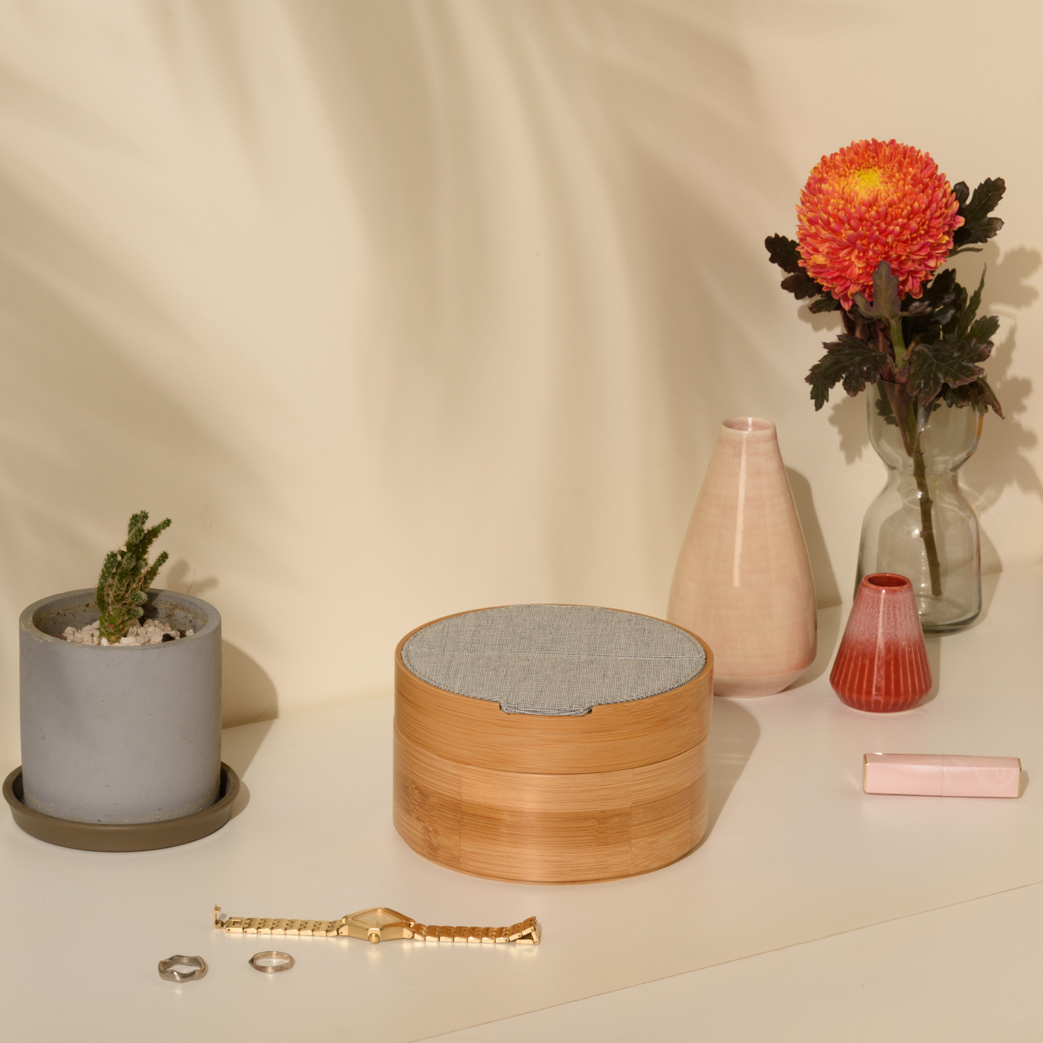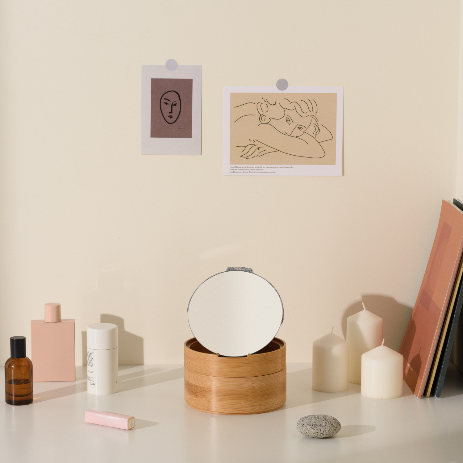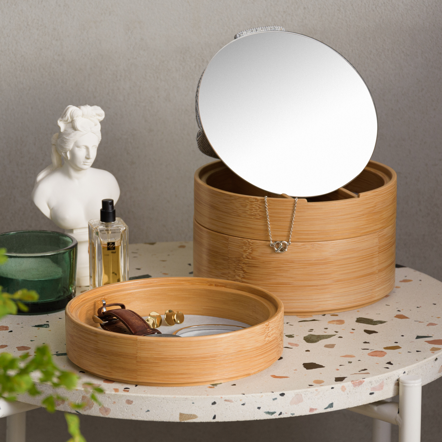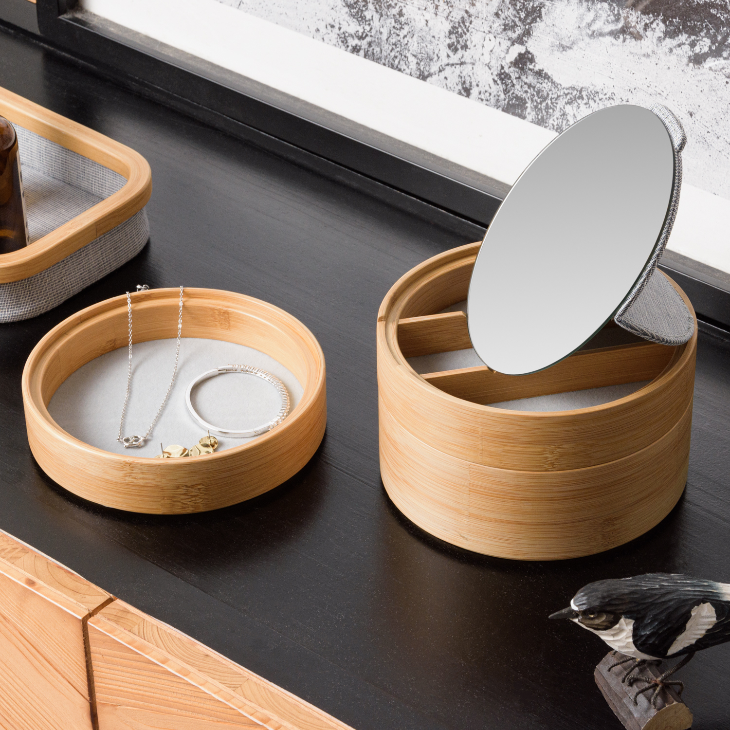以堆疊的圓形淺盤設計出收納飾品的珠寶盒,上蓋附鏡子方便梳化,內部分格設計可分類收納戒指、耳環、項鍊等飾品,並貼合絨布保護飾品不被刮傷。 另有單層珠寶盤可依收納需求加購。