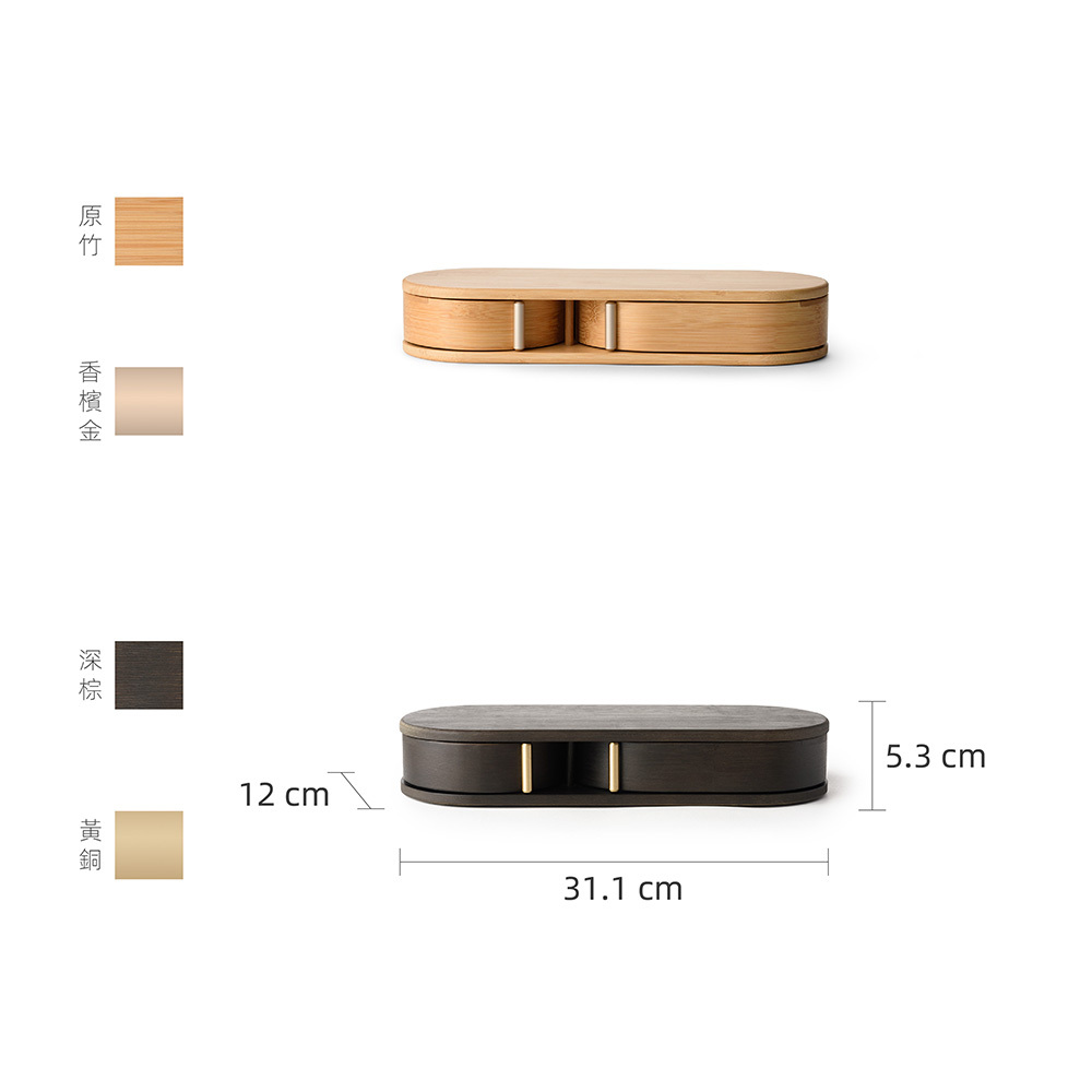 由兩個不同大小的圓弧形內盒組成,盒底貼合質感絨布,用來妥善放置各式的文房具,旋轉打開的模式是設計新巧思,並藉由內嵌磁鐵定位,幫助完整的闔起。