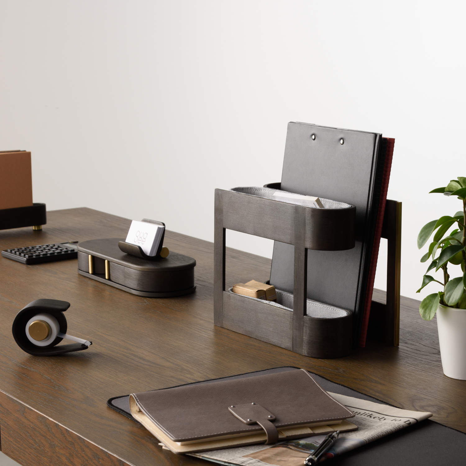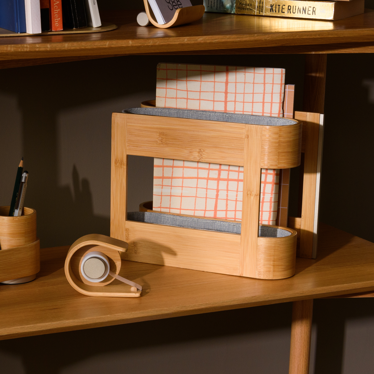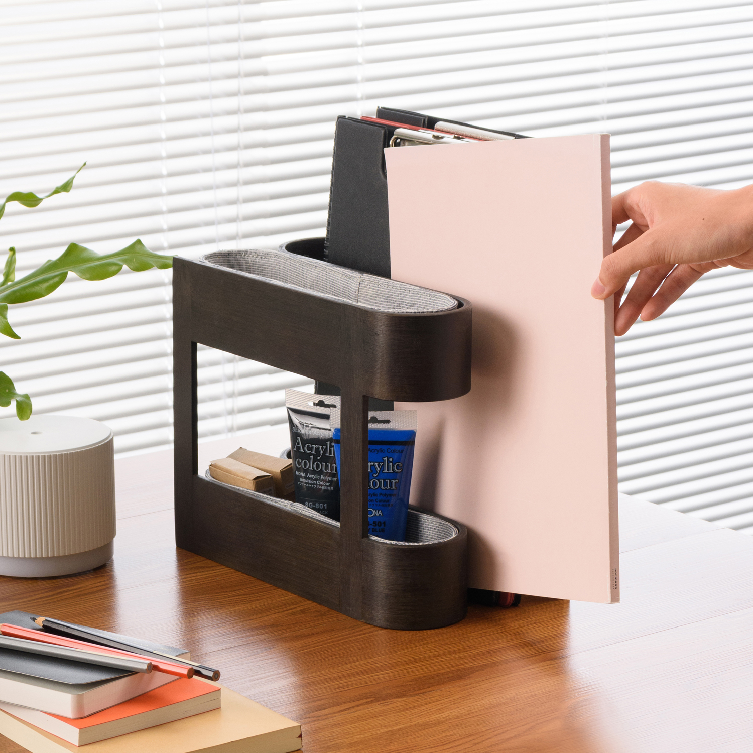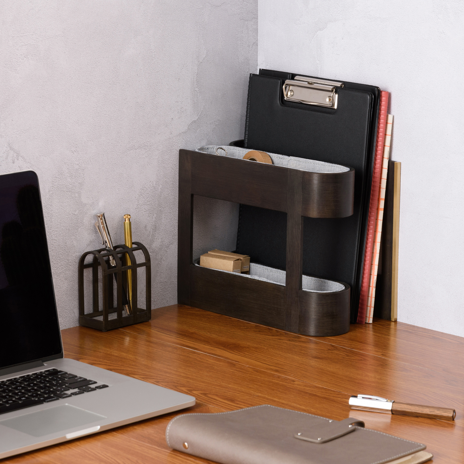 上下雙層小物架,可以收納便條紙、釘書針、膠水…等等小型文房具,旁邊的狹長空間用來擺放雜誌、文件、書本…等,一舉兩得。