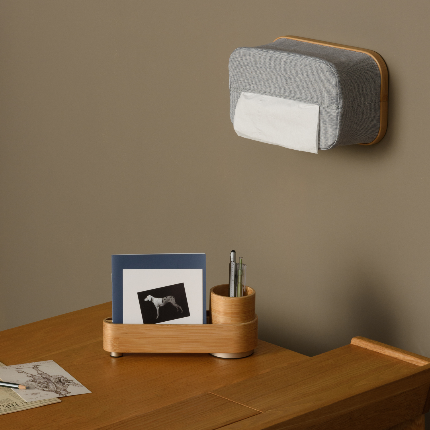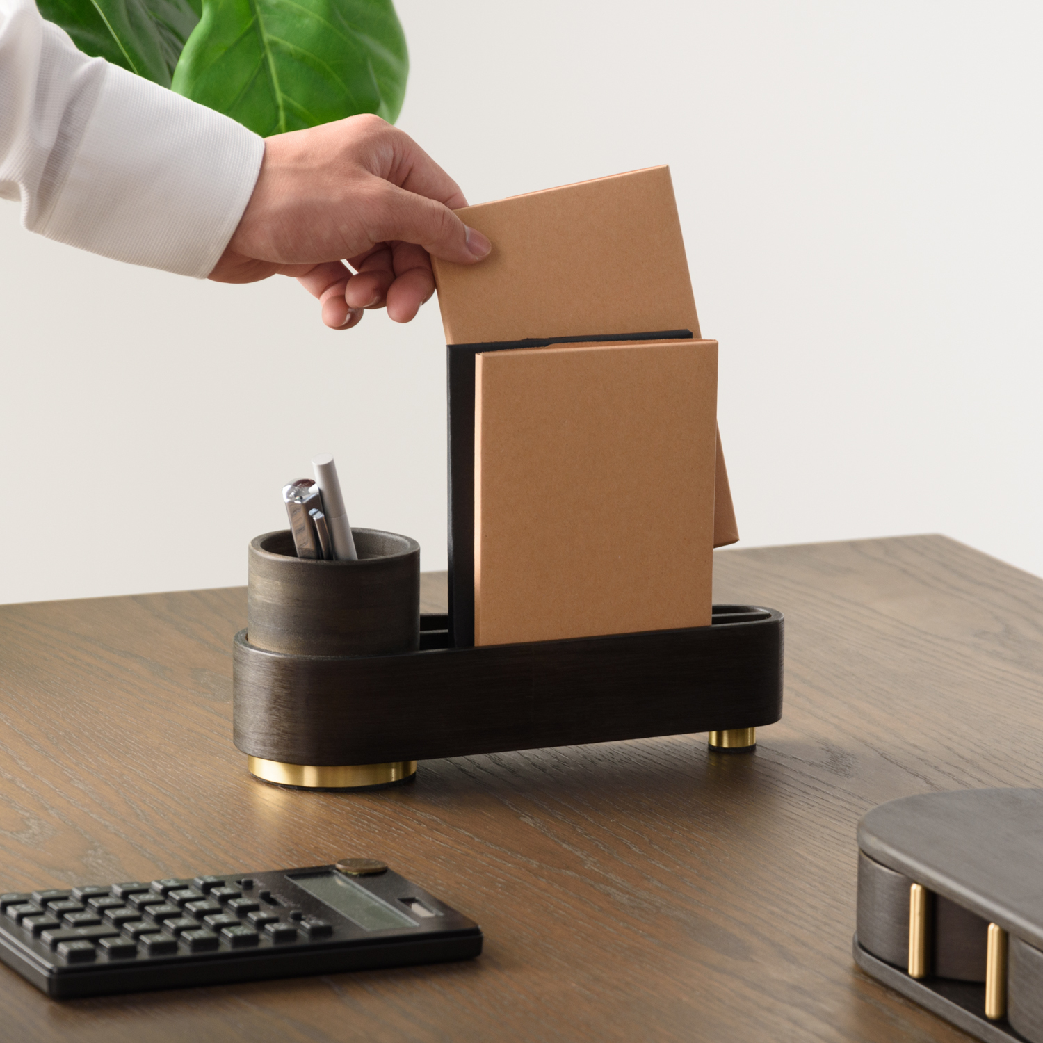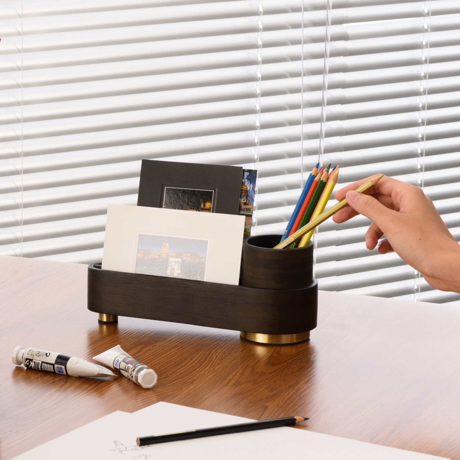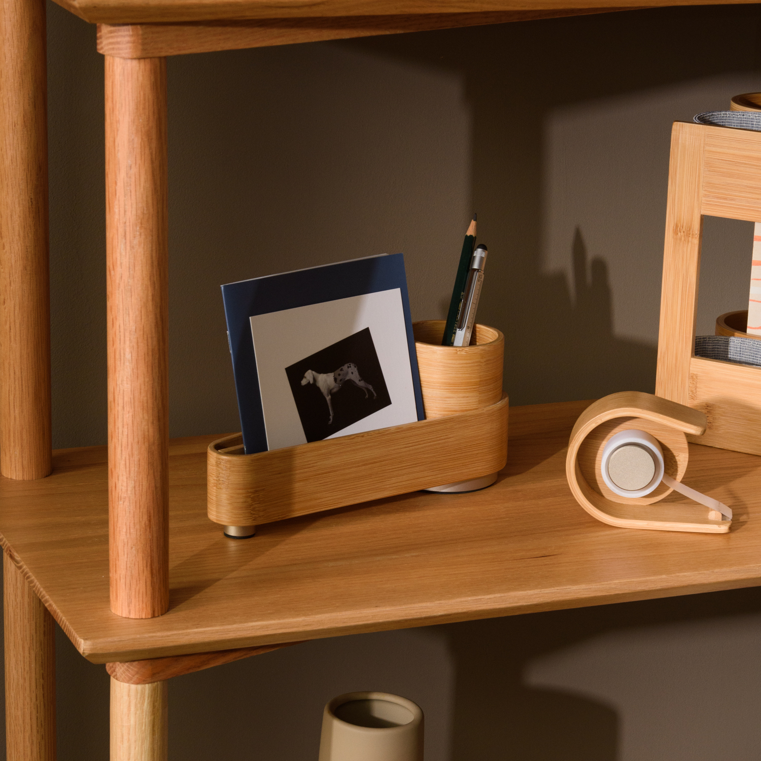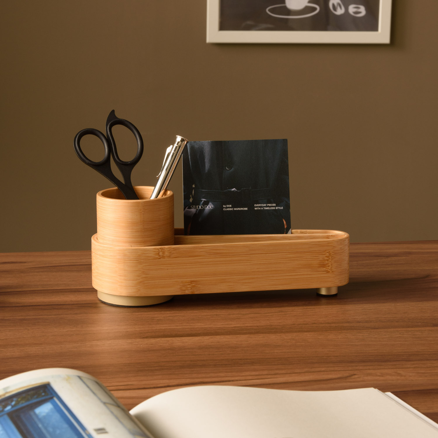 多功能桌上收納用品,用筆筒的圓向外延伸出放置信件、明信片、小卡片…等等的空間,視覺上則以金屬點綴在自然竹材上,表現沉穩的高級感,獨特的造型讓桌上的收納用品除了收納,還具有美化空間的價值。