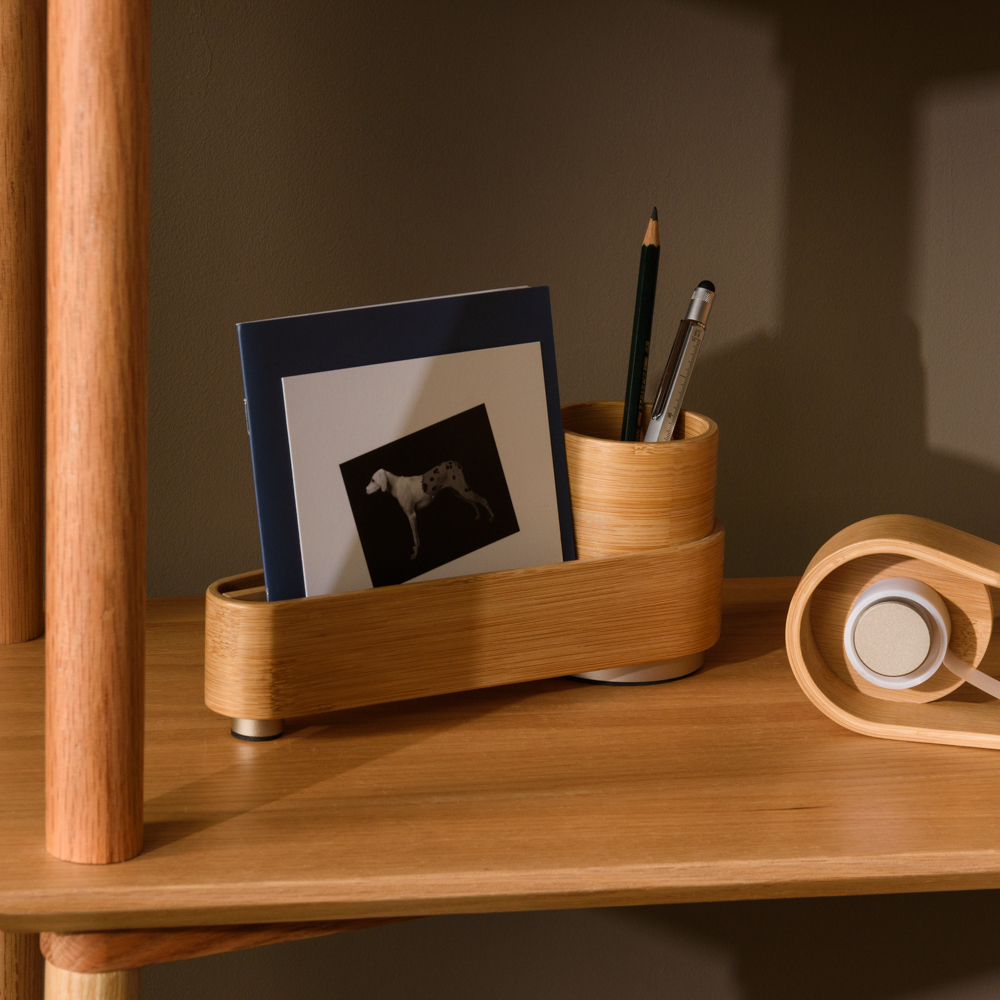 多功能桌上收納用品,用筆筒的圓向外延伸出放置信件、明信片、小卡片…等等的空間,視覺上則以鋁合金點綴在原竹色的弧形竹片上,表現自然優雅的質感,獨特的造型讓桌上的收納用品除了收納,還具有美化空間的價值。