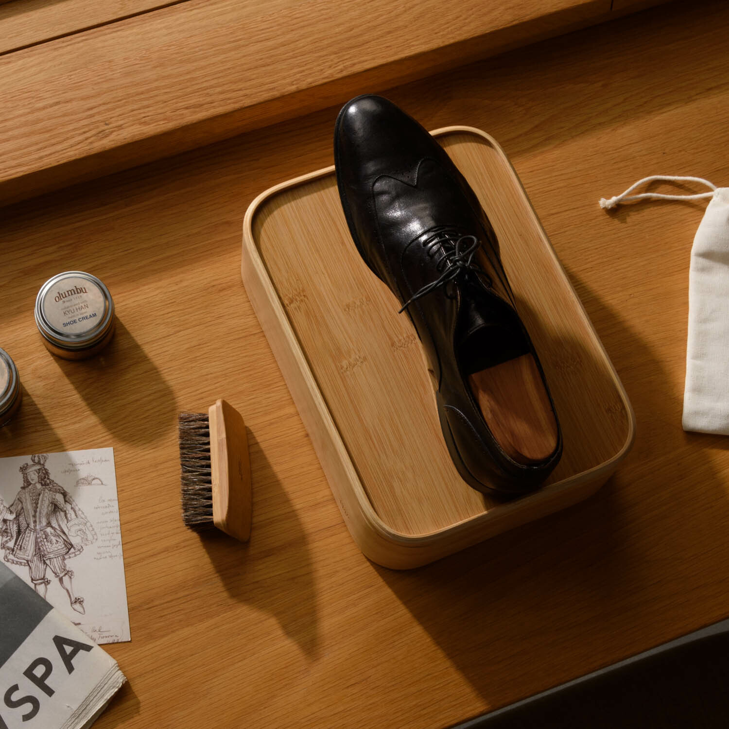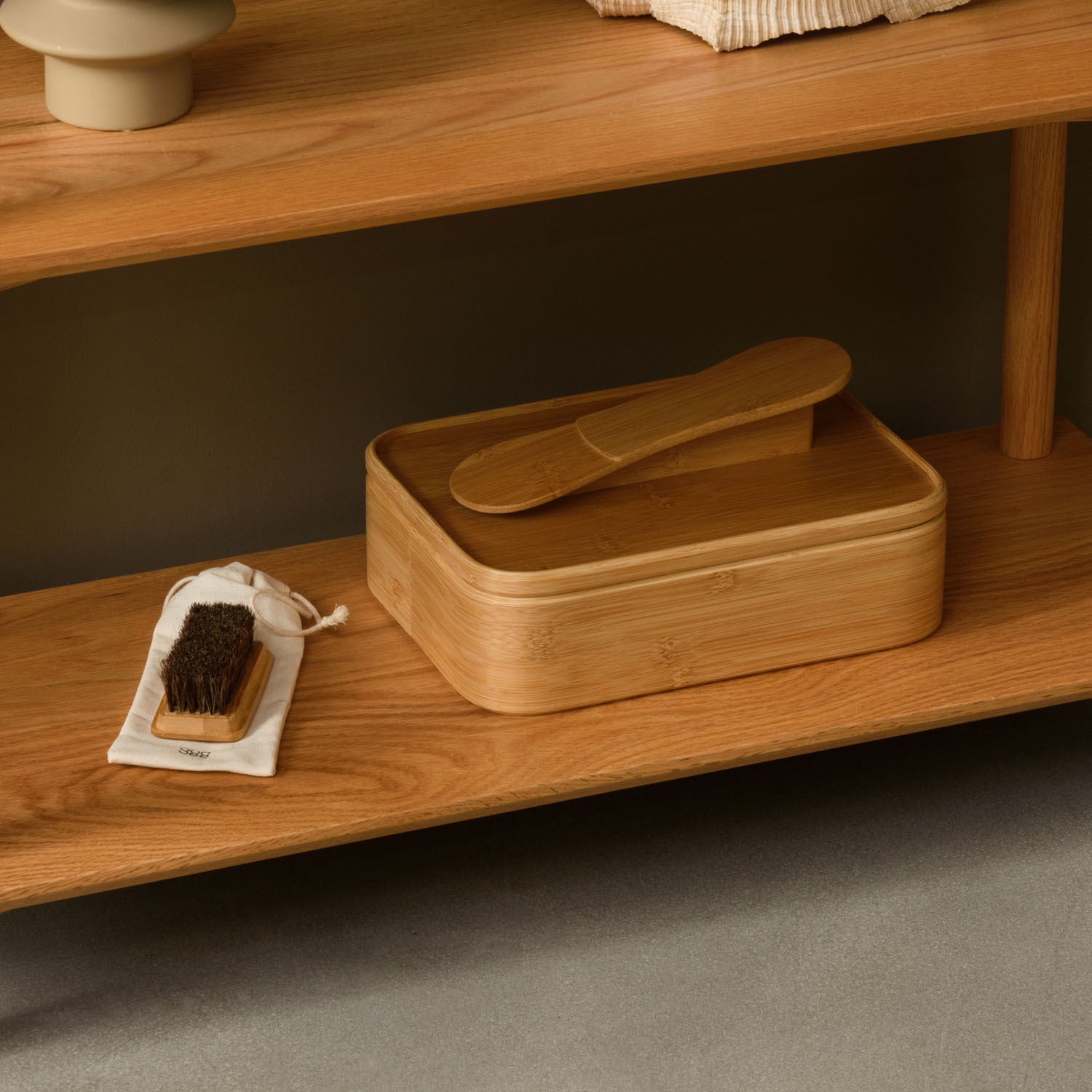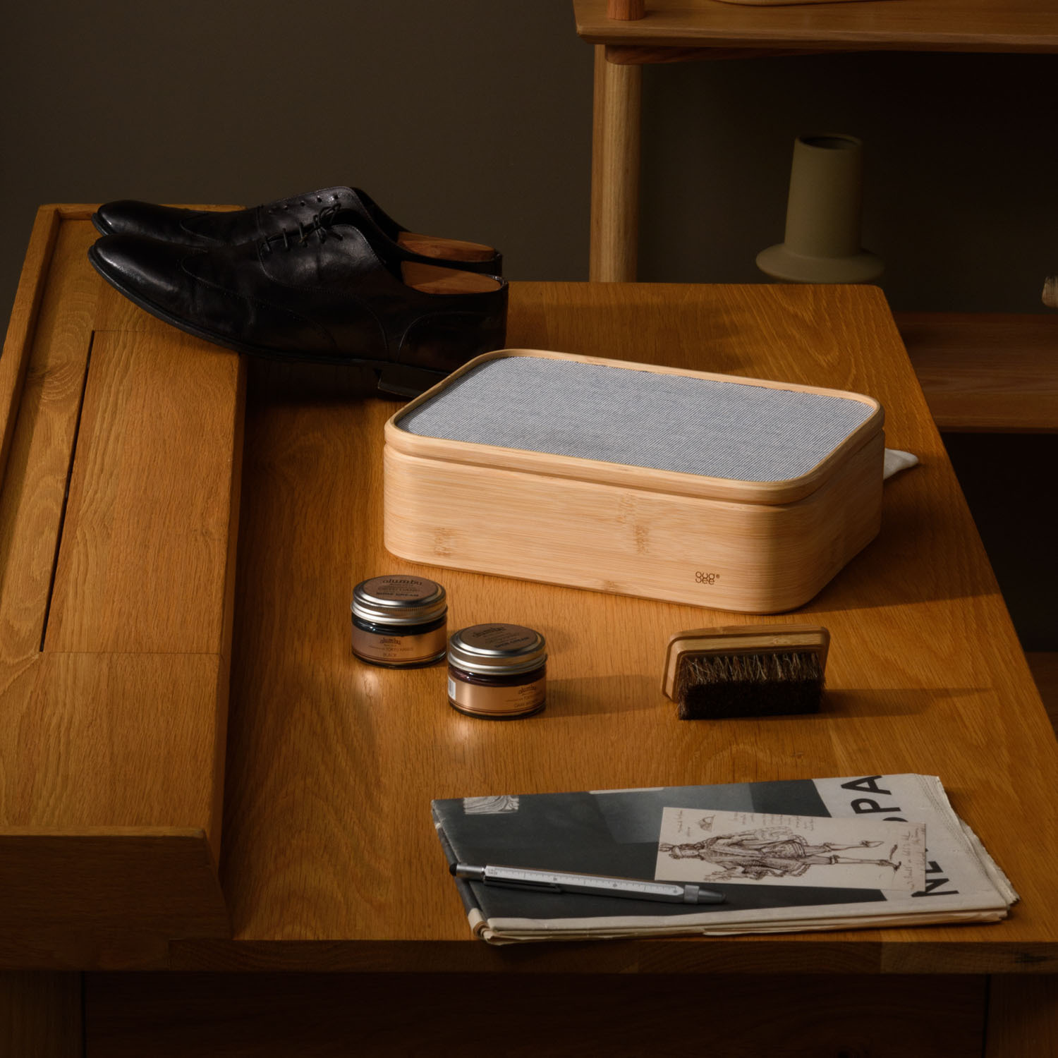 RICO 擦鞋箱套組是將早期於西方國家較常出現的擦鞋箱,以現代角度重新詮釋,讓珍惜鞋子的人擁有一組專門工具好好保養鞋履。此產品以大面積的竹板製成鞋箱本體,經過仔細打磨後的竹板擁有非常溫潤的觸感,表面的自然紋路,更讓每一個擦鞋箱都獨一無二。