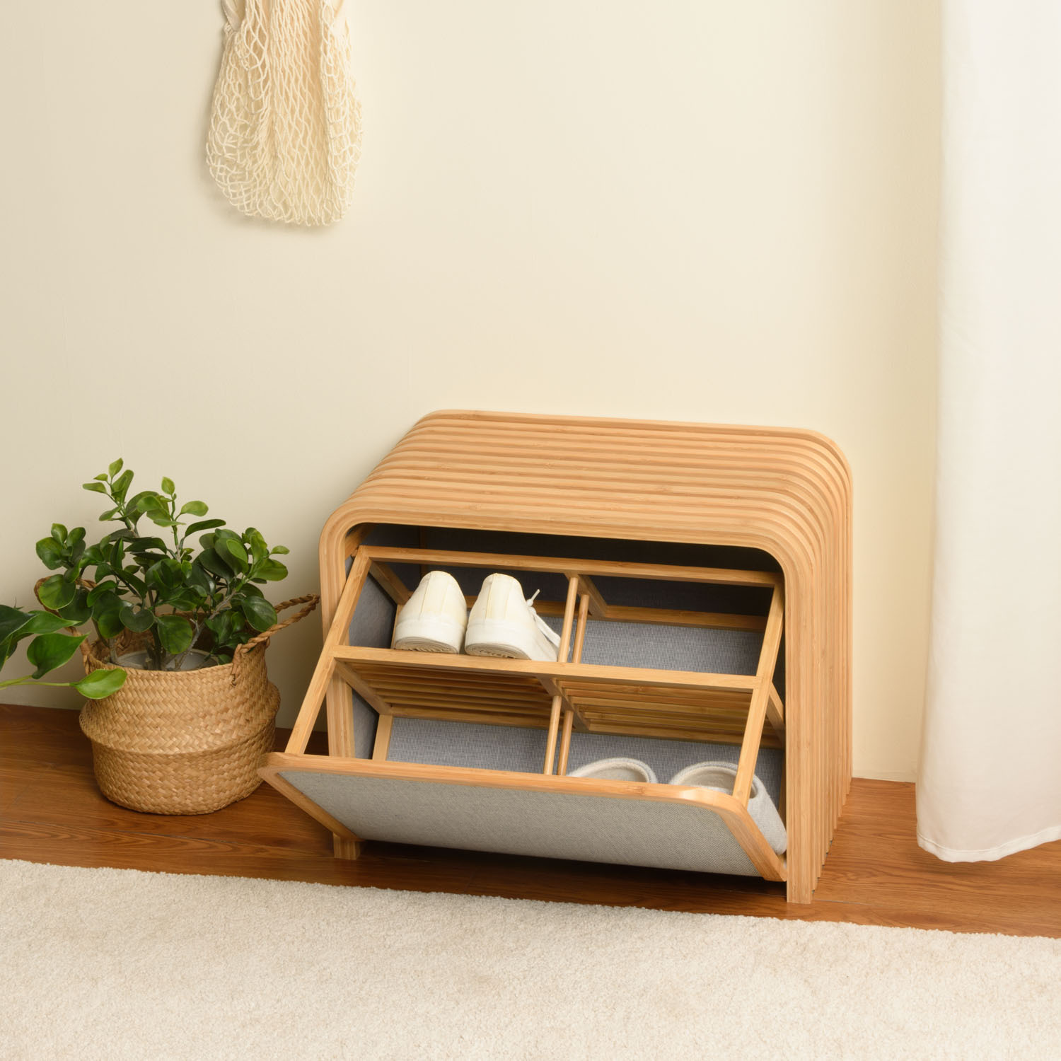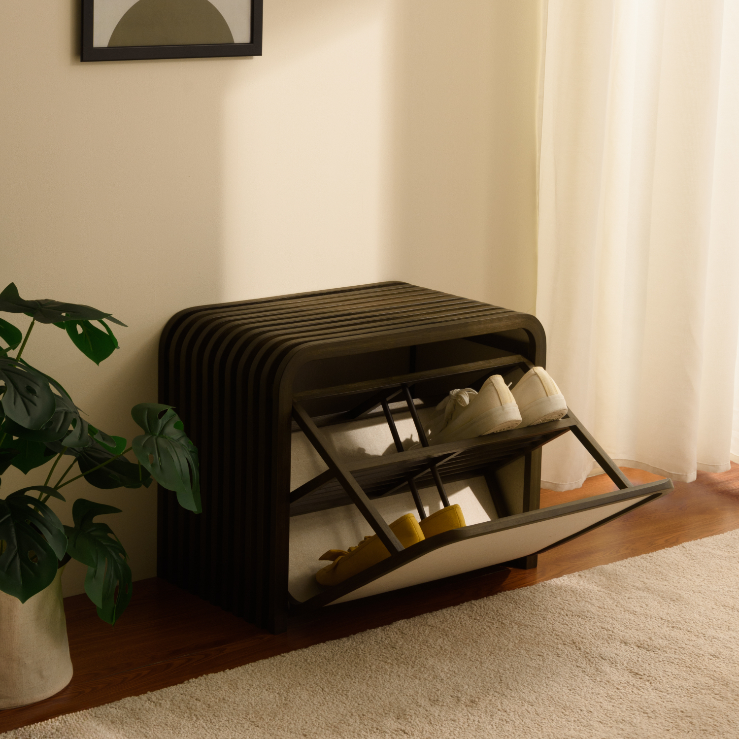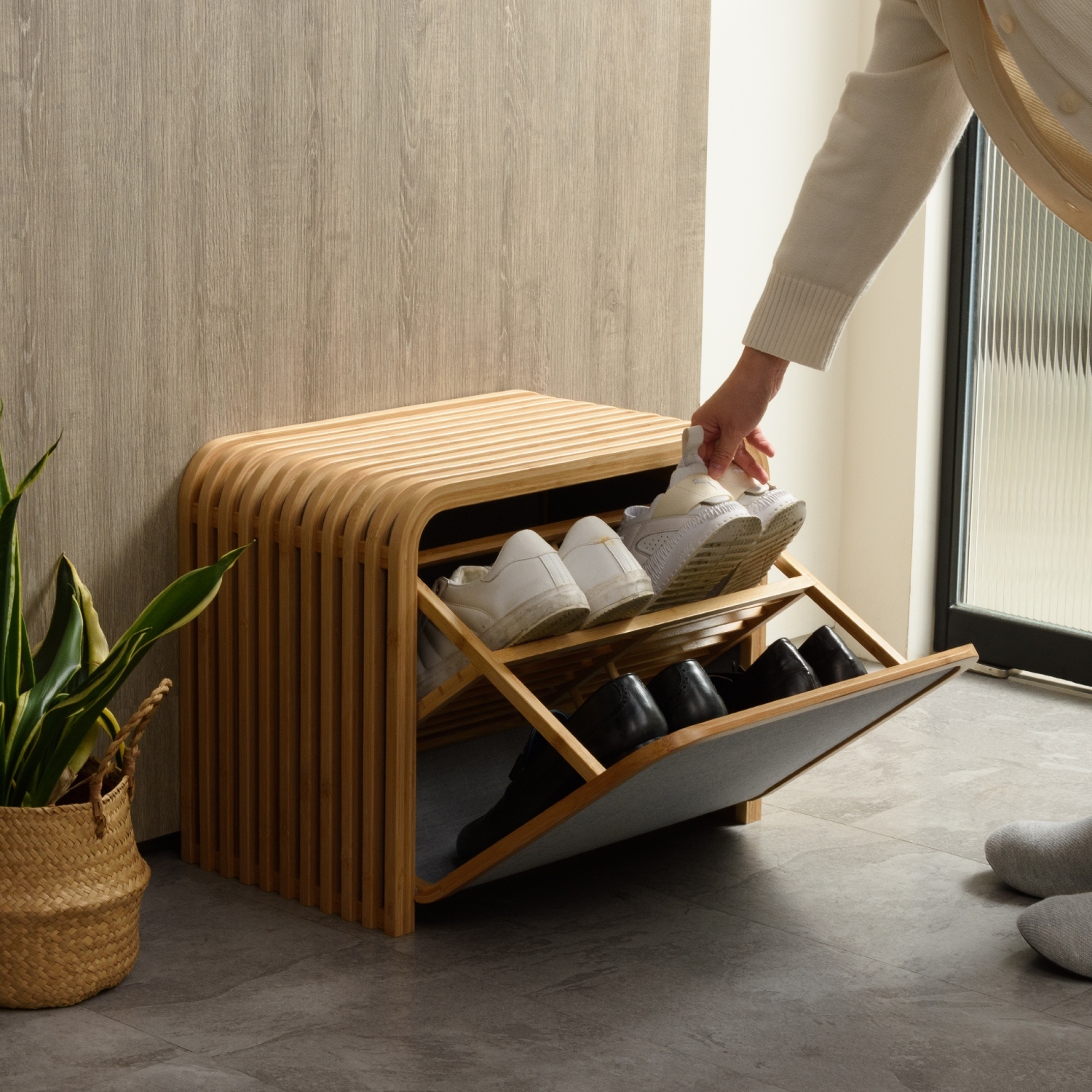 細緻圓角竹框排列而成的穿鞋椅,結合鞋櫃+椅凳的功能,免組裝,可承載重量為 120kg。 實用的雙層收納空間以及貼心的前開式設計讓使用上更便利,小玄關也放得下。