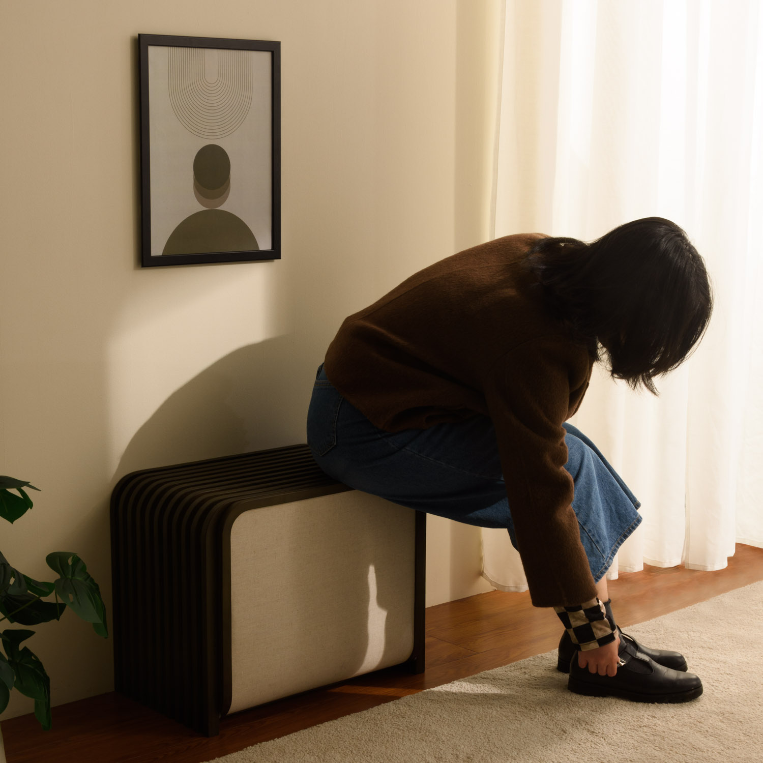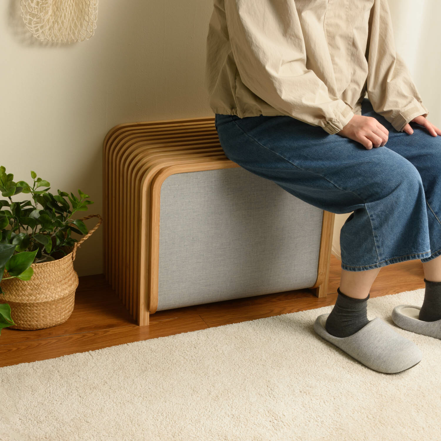 細緻圓角竹框排列而成的玄關穿鞋椅,結合鞋櫃+椅凳的功能,免組裝,可承載重量為 120kg。