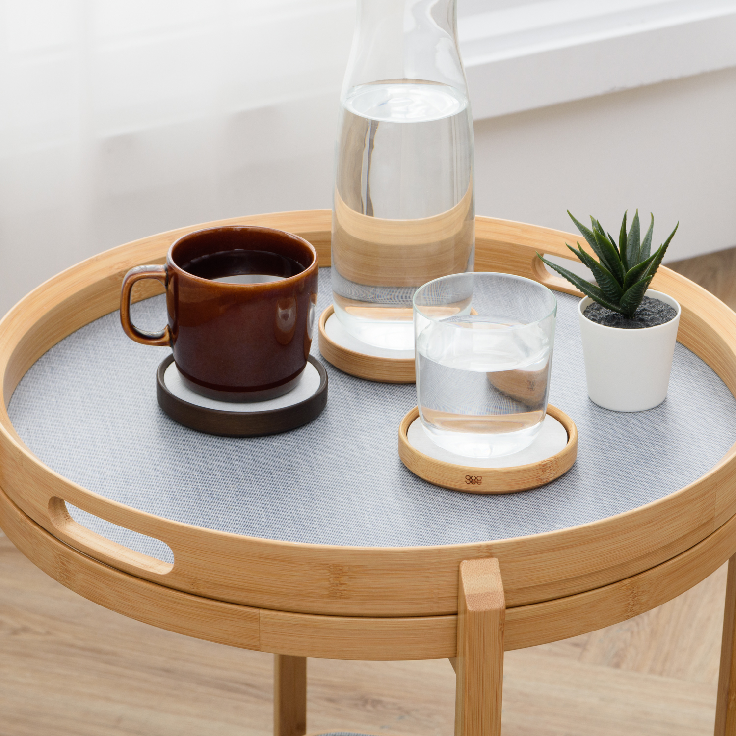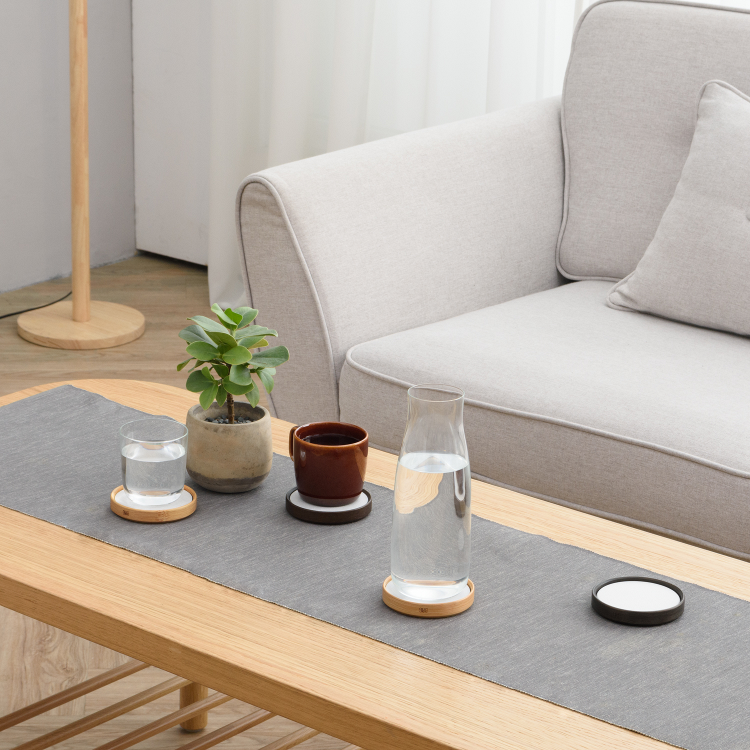 利用珪藻土能夠快速吸收水份的特性,加上圓形竹框的溫柔環繞,使得 TRIVI 杯墊簡約又有質感。