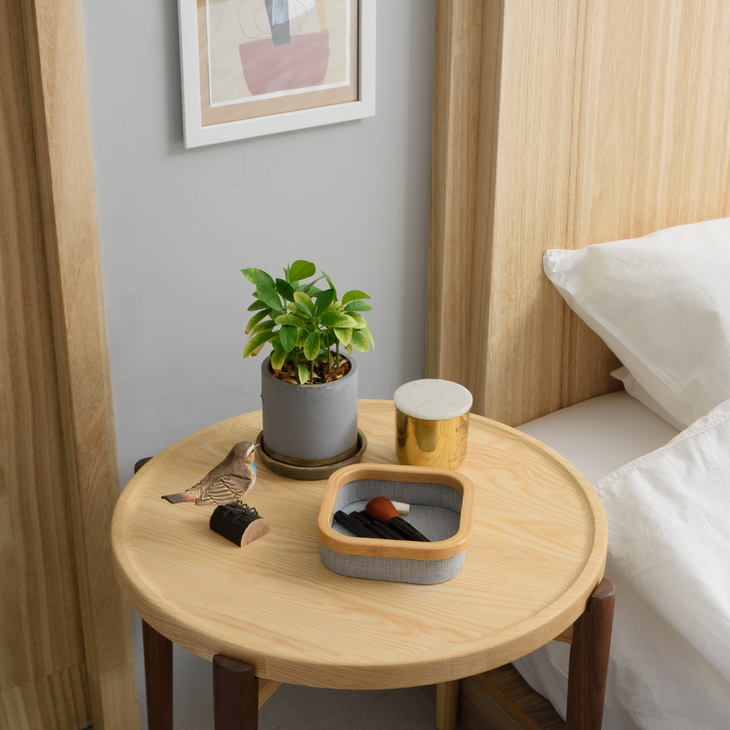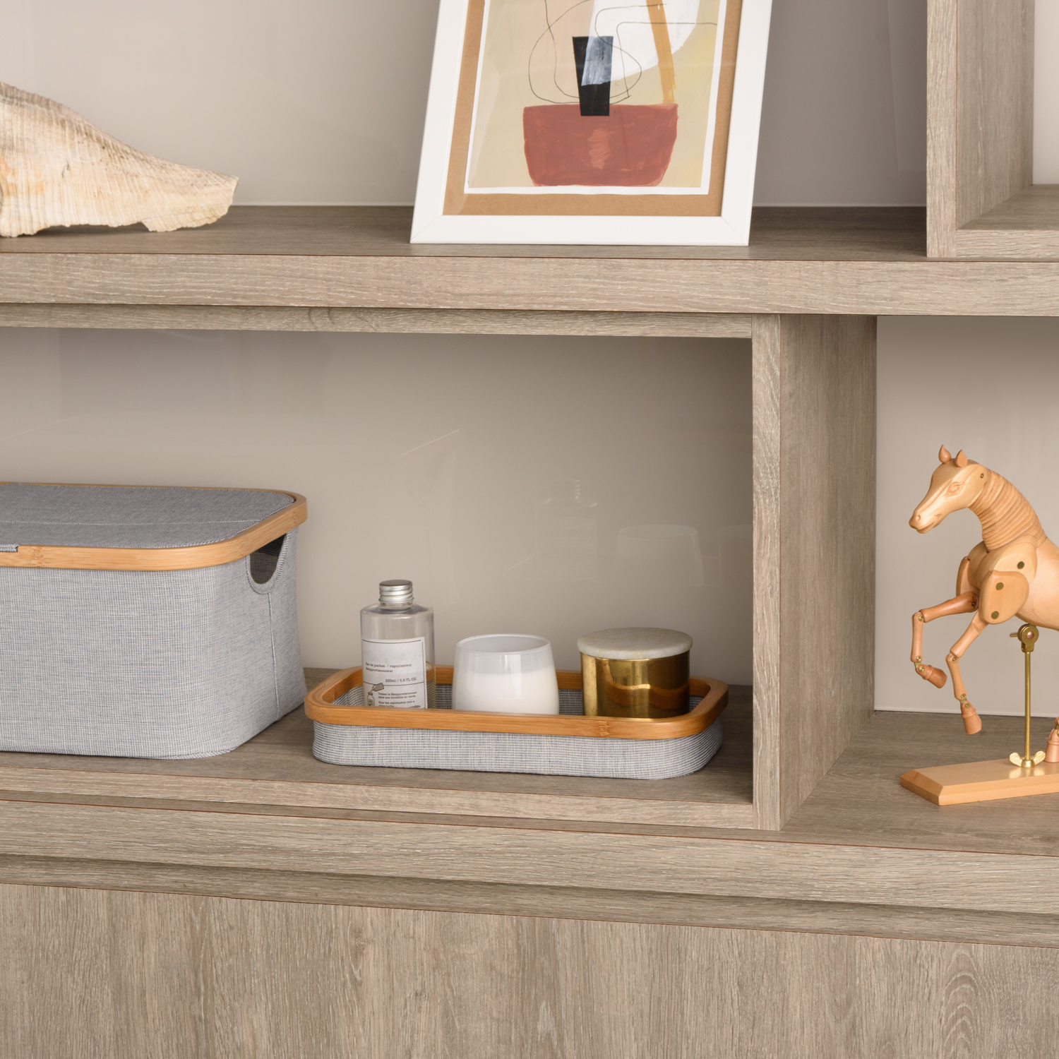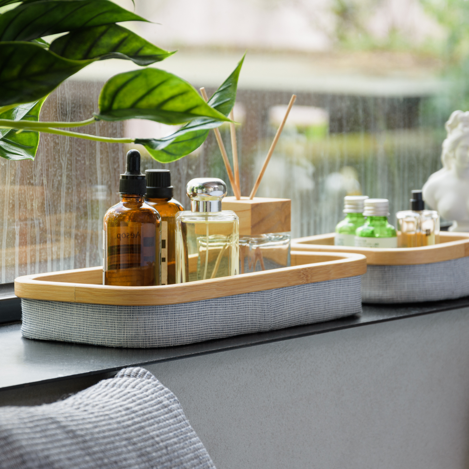 細緻竹框與布料結合的收納淺盤,放置各式飾品小物都合適,可搭配同系列其它尺寸使用,或作為抽屜分格收納,讓居家空間更整齊俐落。